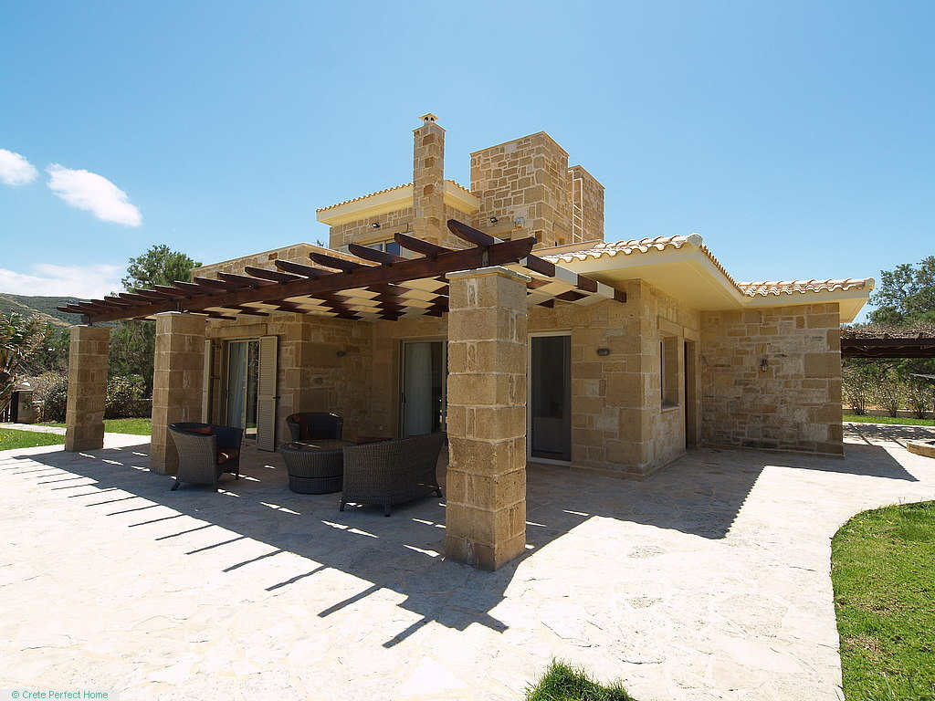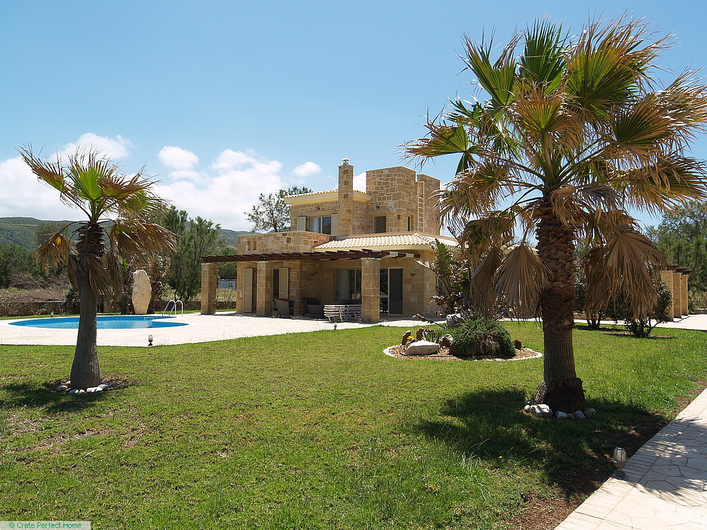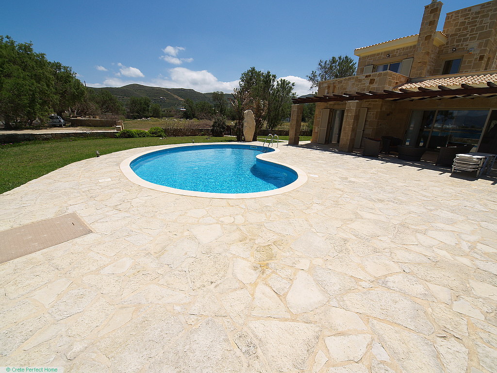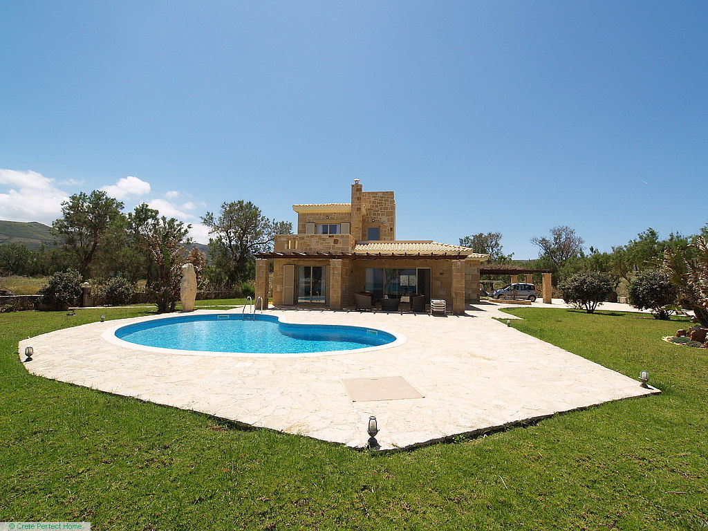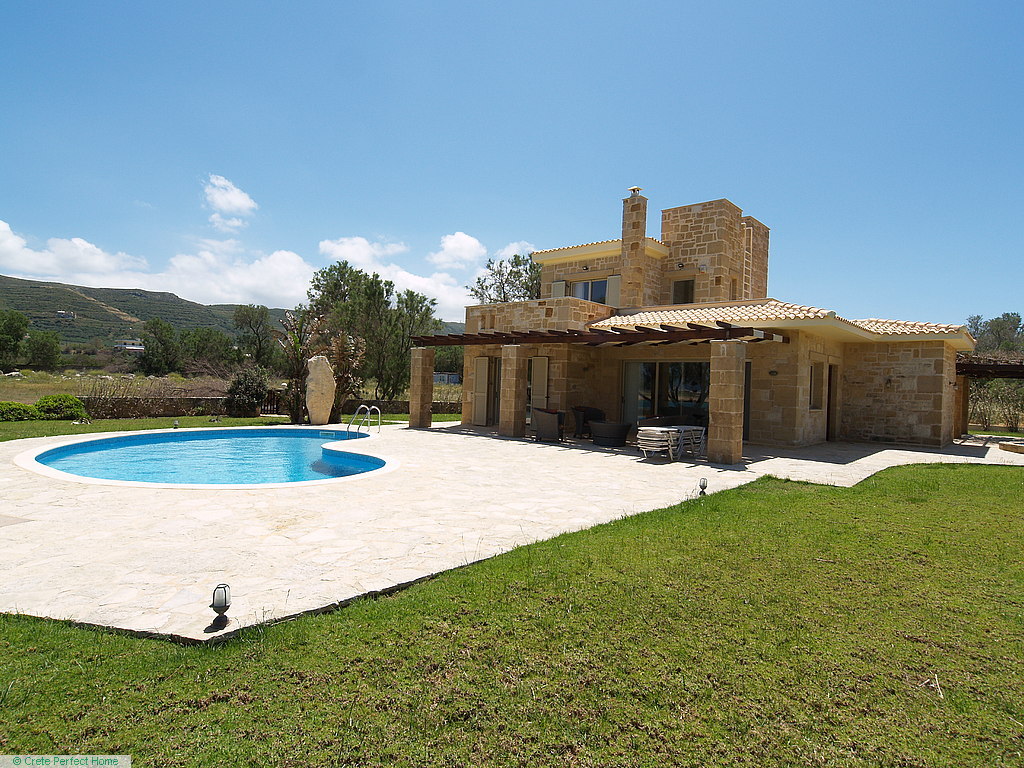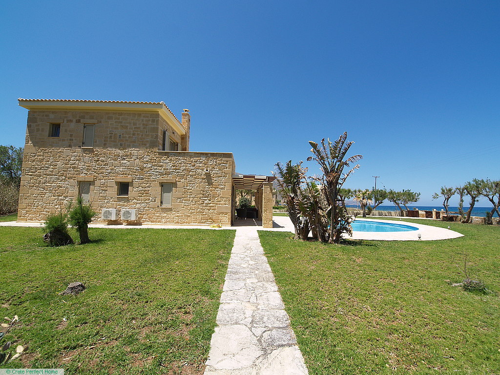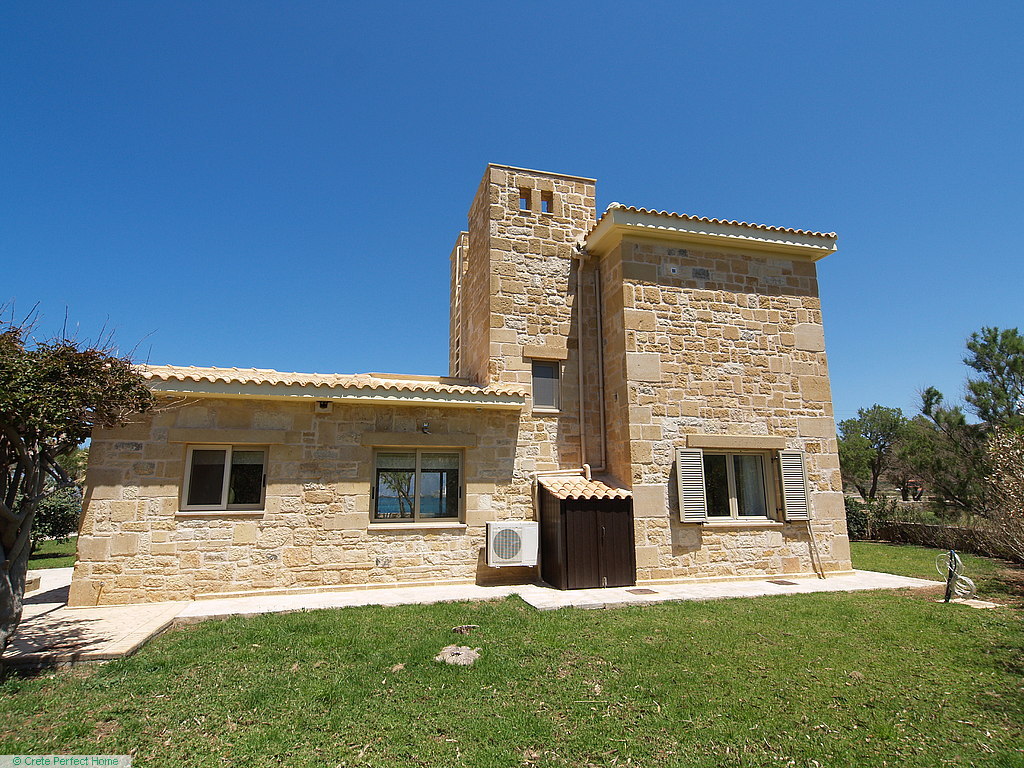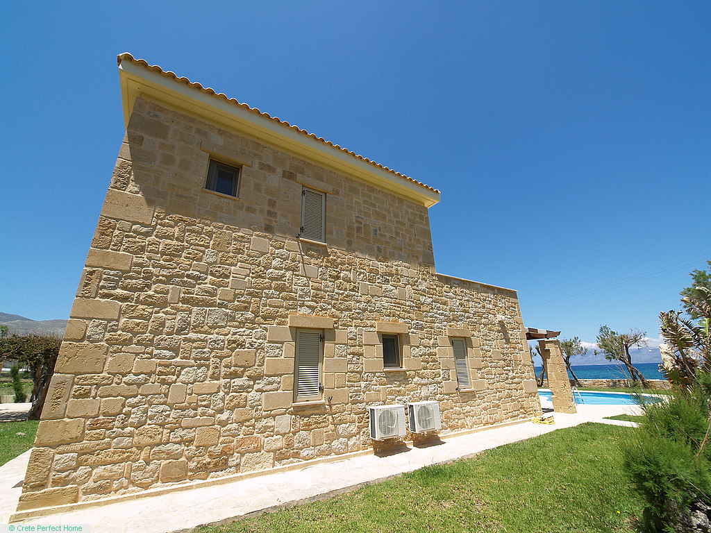Gorgeous modern 146m2 stone-built villa in large beachside plot with swimming pool, 3 bedrooms & 3 bathrooms, 1,980m2 plot, fabulous sea views, 5 mins Kissamos, 30 mins Chania, all services connected.