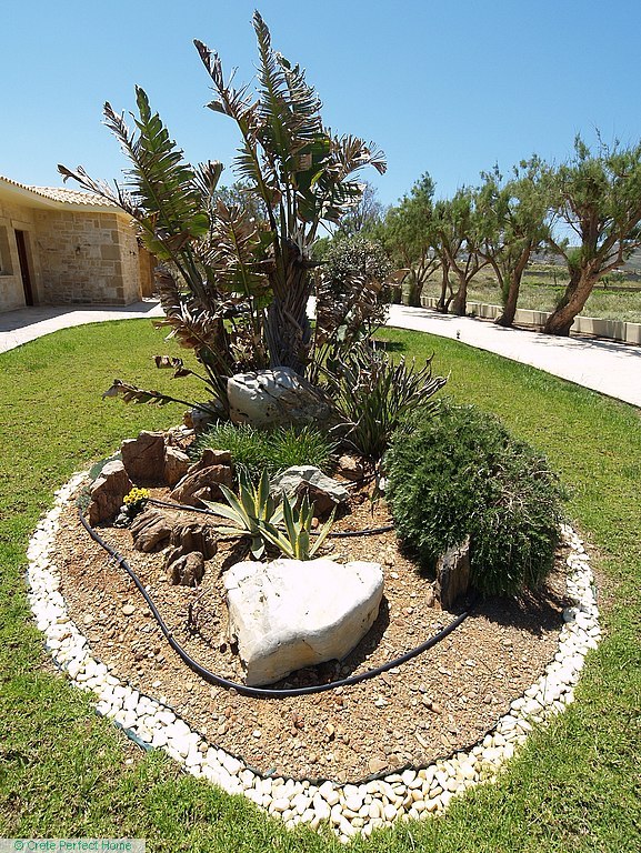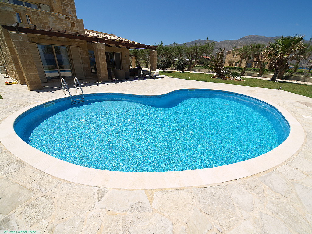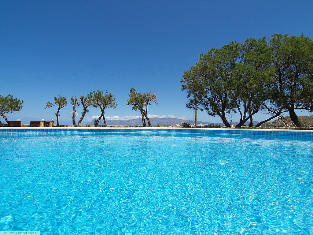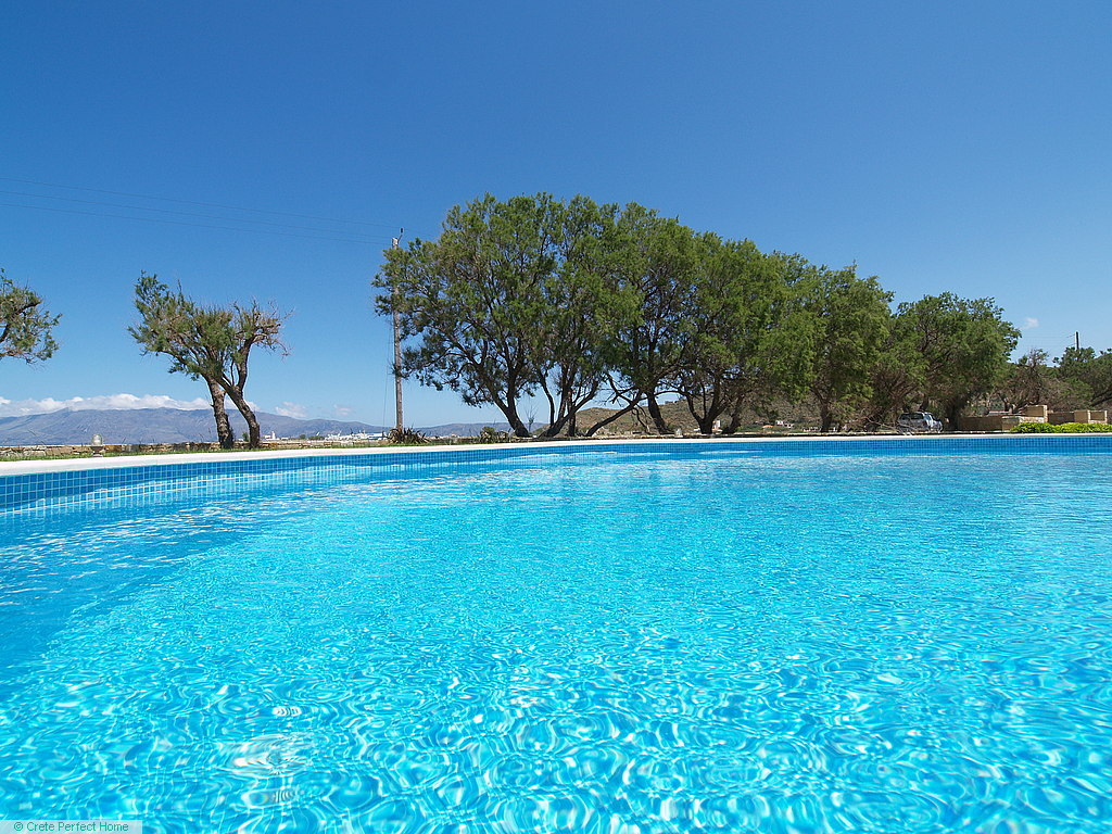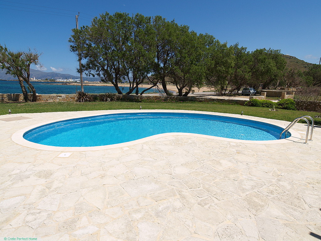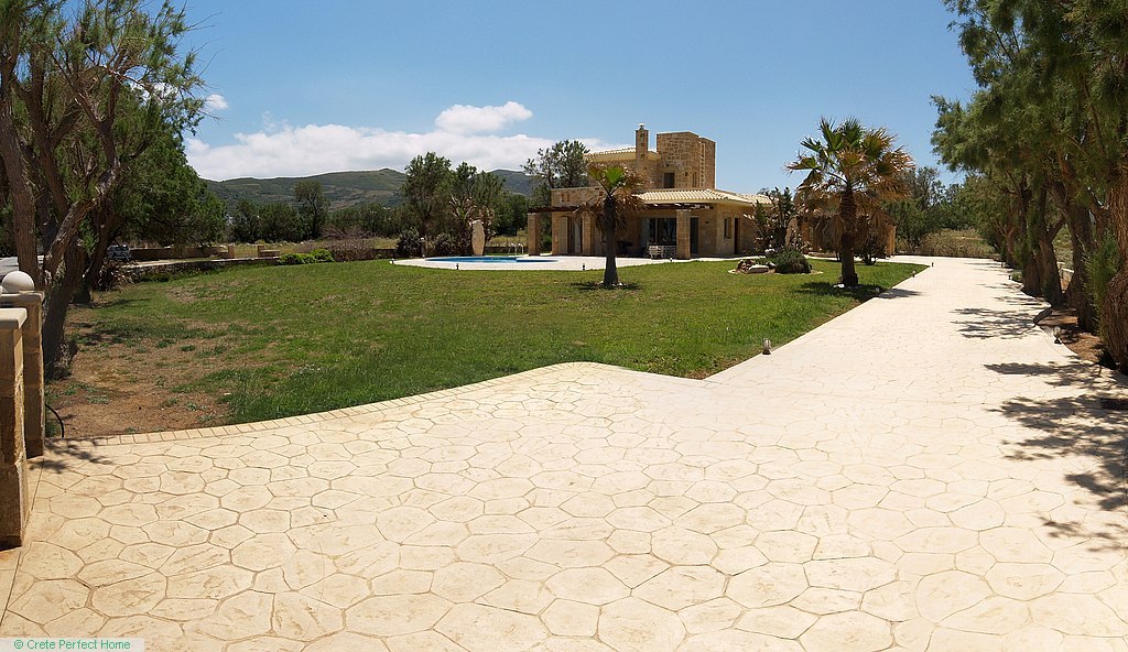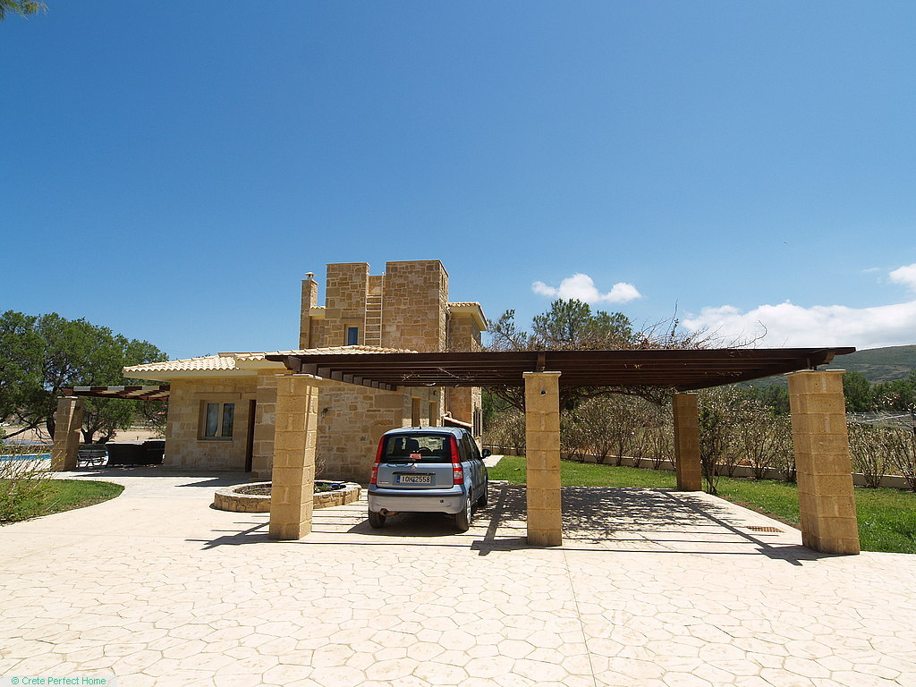 The villa is situated in a large plot, with a well-maintained grassed and walled garden containing mature trees and plants; stone planters; a 50-metre drive; a bougainvillea-shaded carport; parking for 10+ cars; a 26m2 tiled pool with shower and cream stonework terrace; and a large shaded verandah where you can sip a cool drink and gaze over Homer’s wine-dark sea.