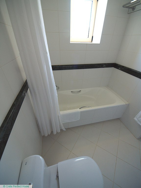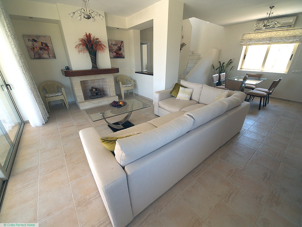 The main entrance door opens into a spacious living and dining area with air-conditioning and a working fireplace, and large glazed balcony doors lead outside to the verandah and pool area. Adjoining the dining area, the kitchen is well-designed and well-equipped, and there is a washroom with sink and WC. There are two spacious bedrooms on the ground floor, both with fitted wardrobes, and one bedroom has balcony doors leading to the verandah and pool area. There is also a large family bathroom with bath/shower, sink and WC, and attractive features fashioned from the local green marble as used by the Romans when they ruled the island.