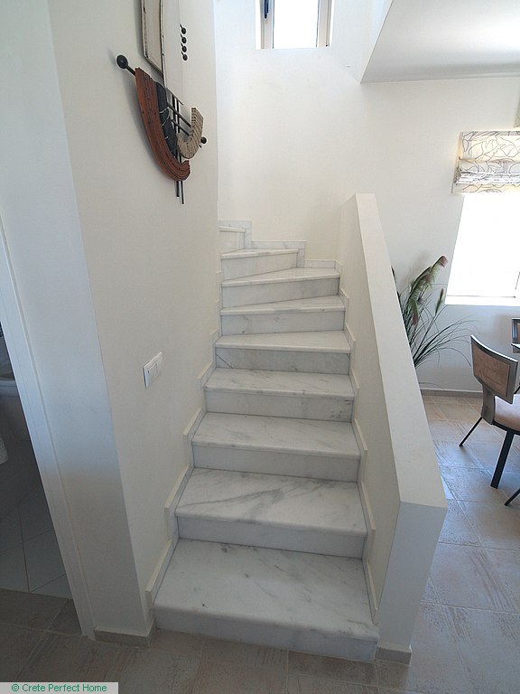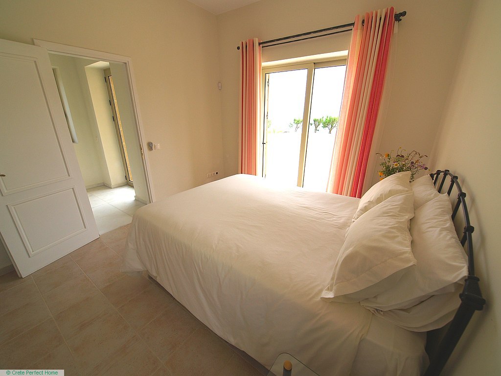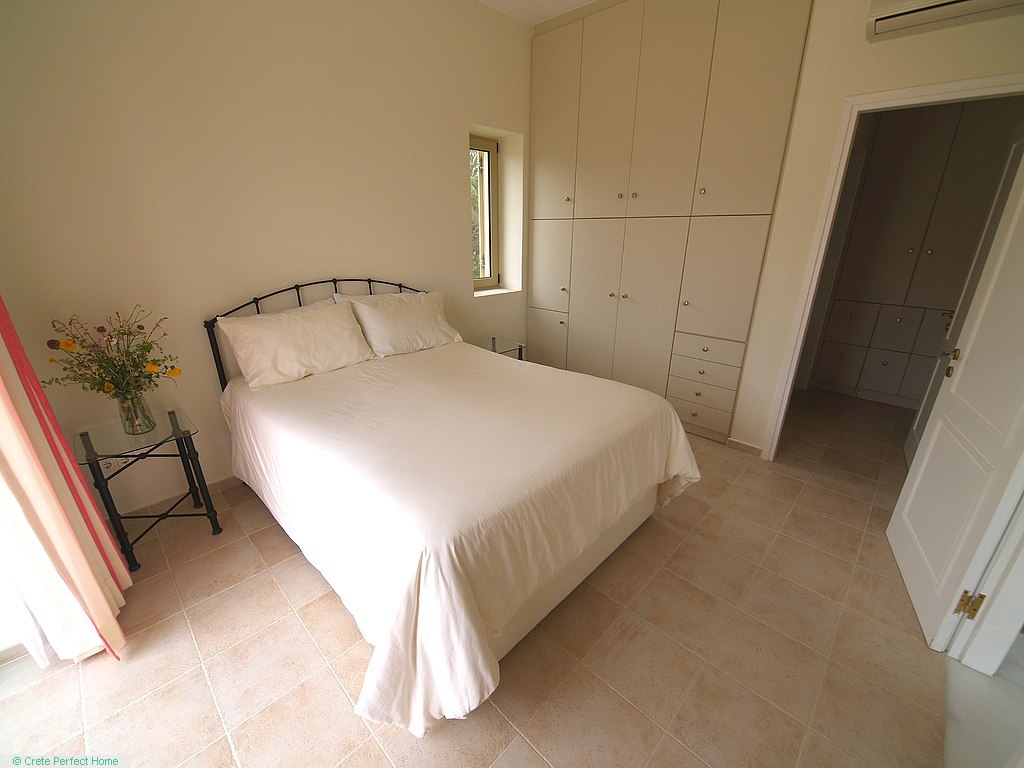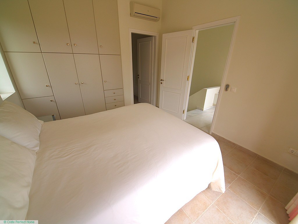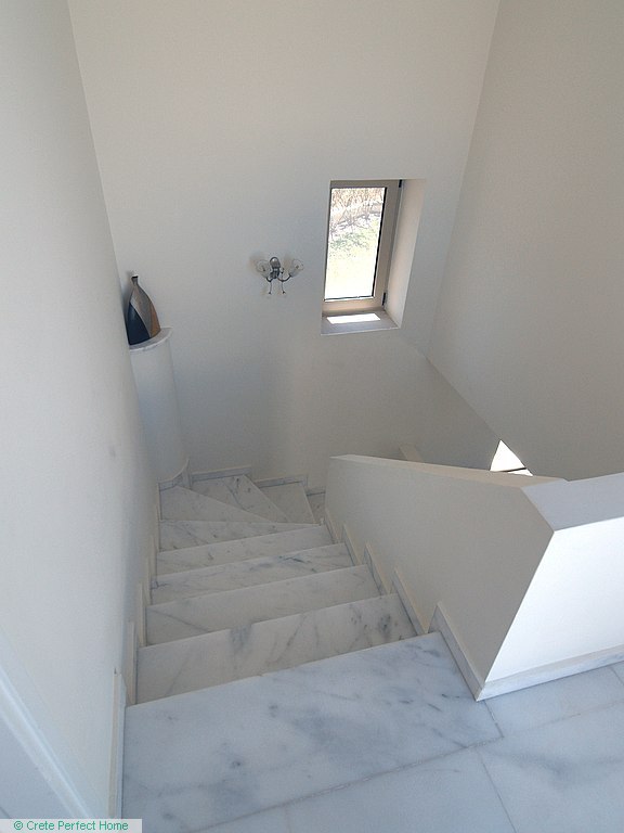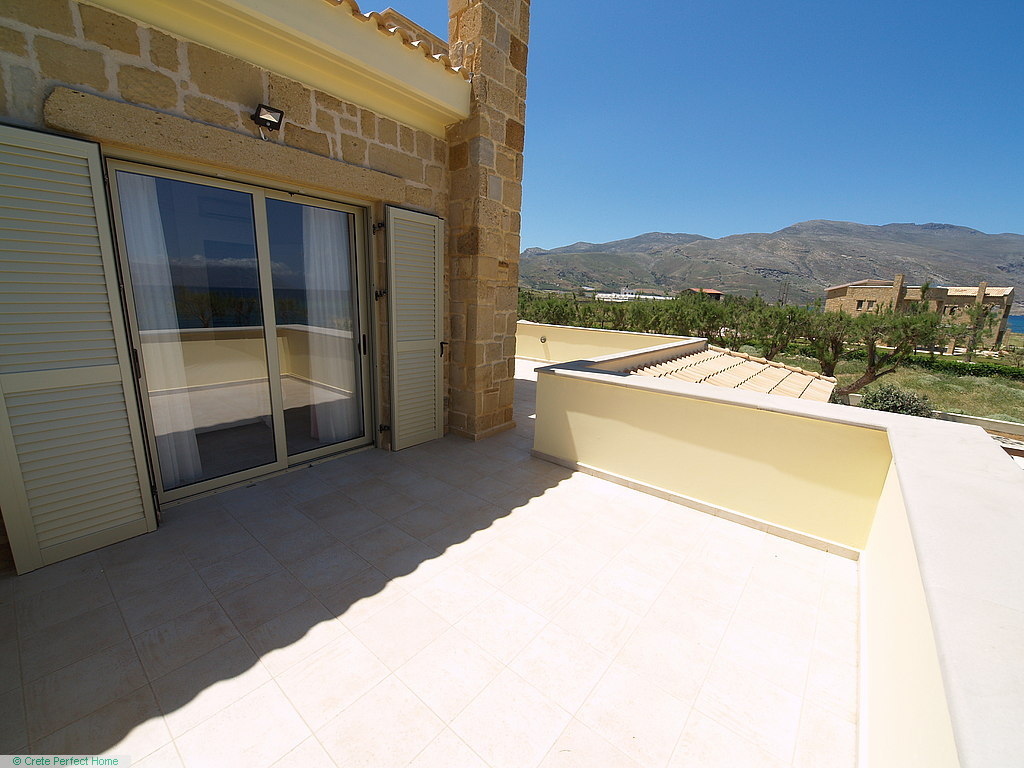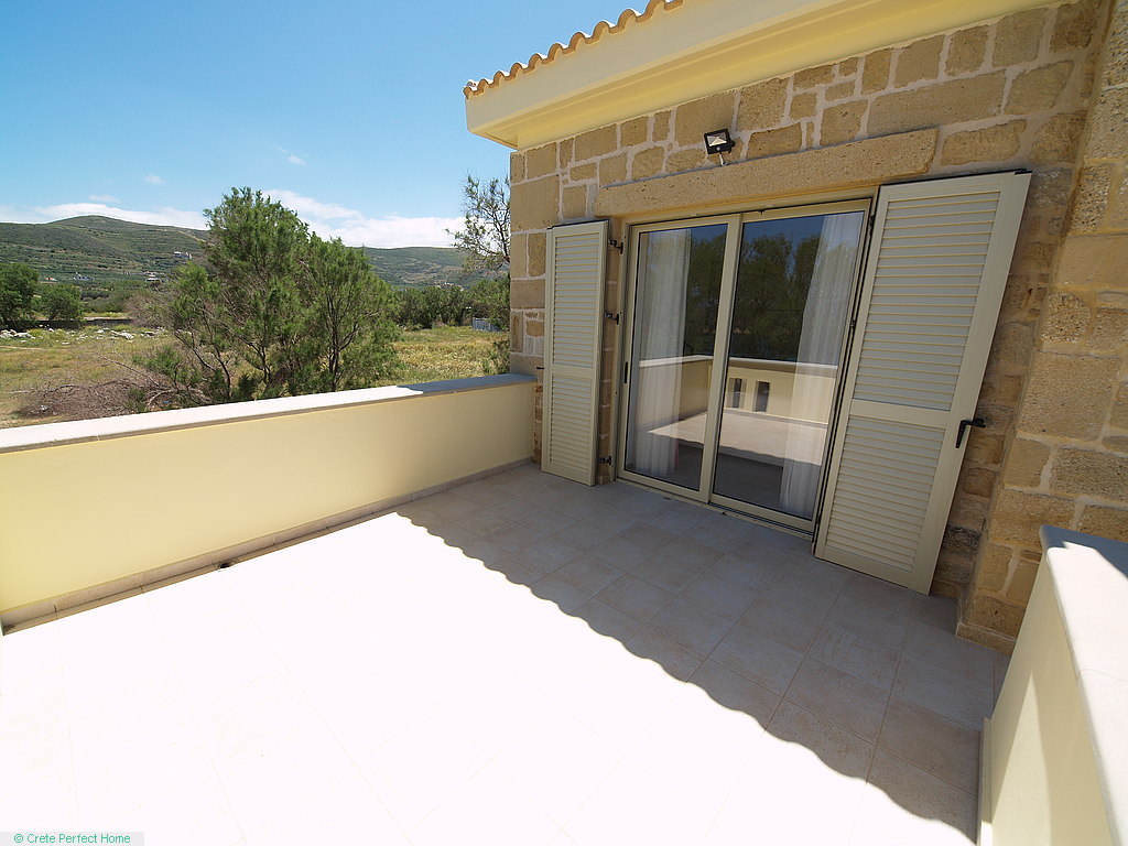 Luxurious white marble stairs lead up to the first floor, where the master bedroom is located. This bedroom has fitted wardrobes, a dressing room, and a roomy bathroom with shower, sink, WC, bidet, and further green marble features. There are also large glazed balcony doors which lead out onto a large balcony with superb views of the Gulf of Kissamos and the rugged mountainous peninsulas of Gramvousa and Rodopos.