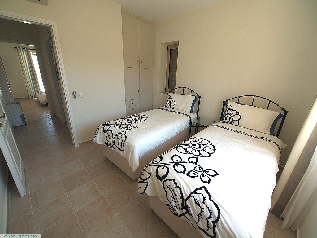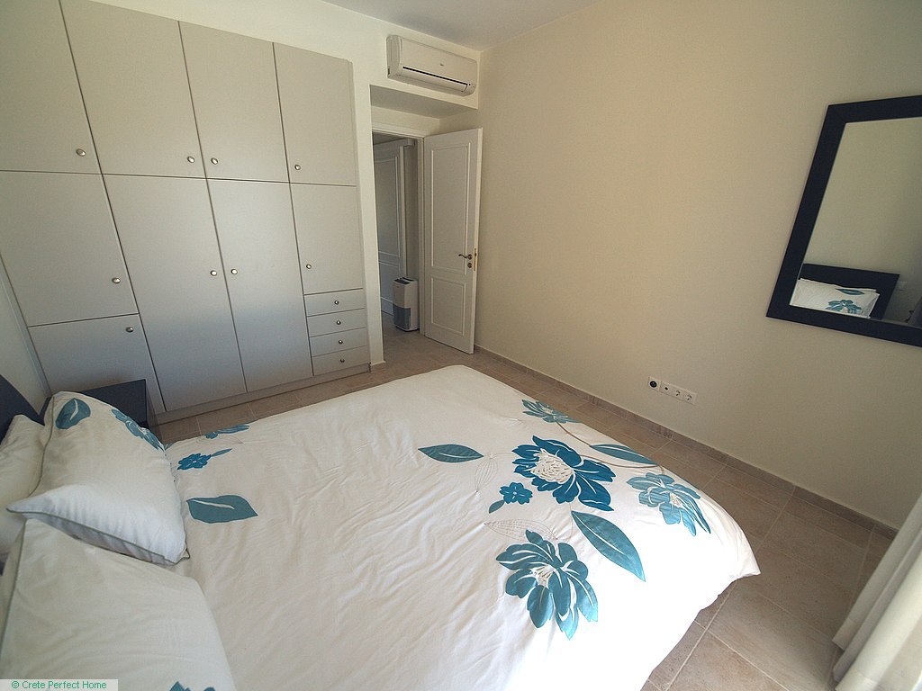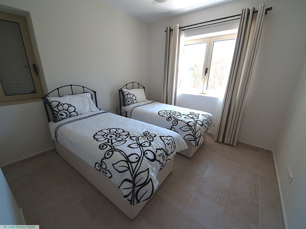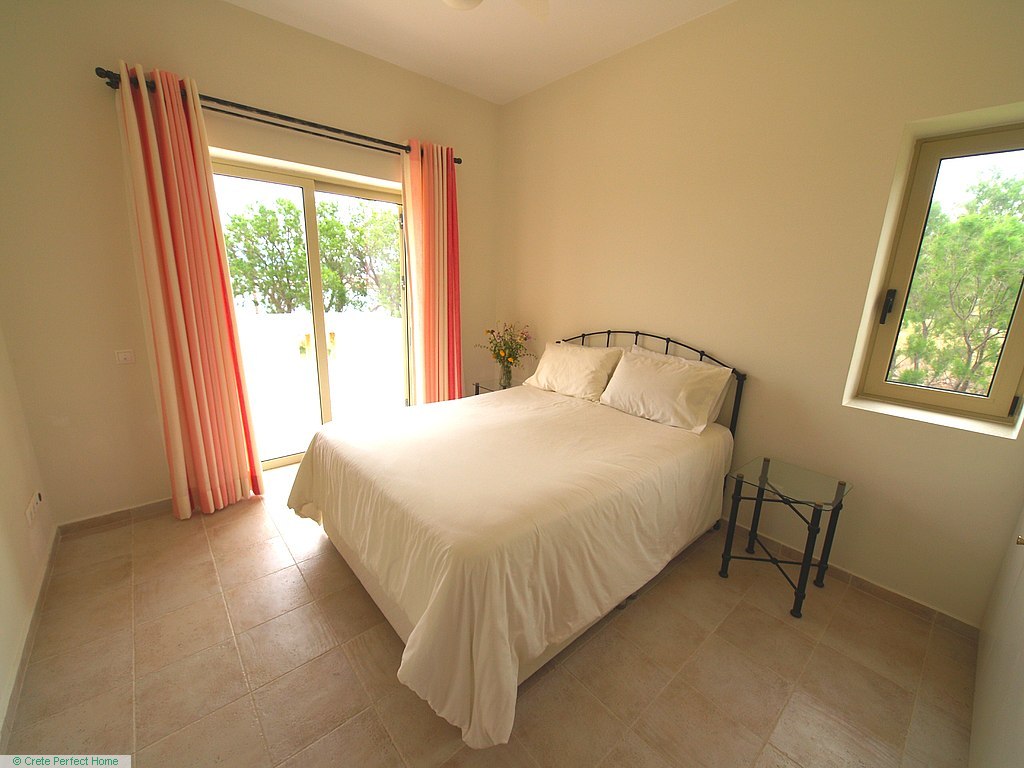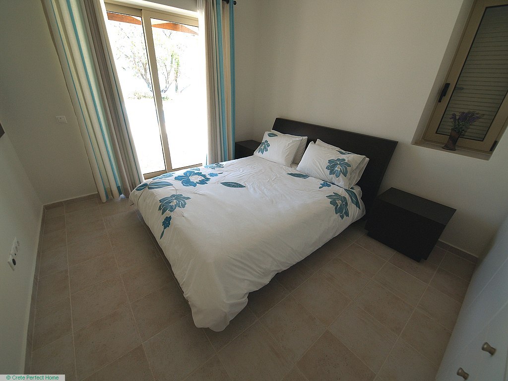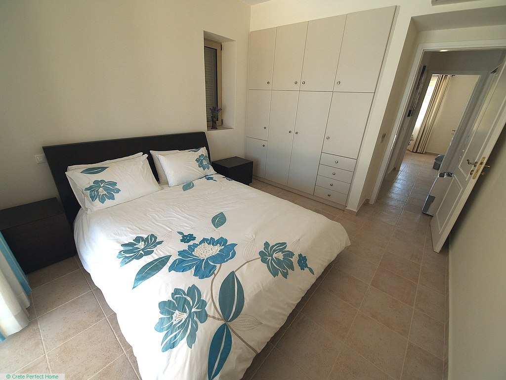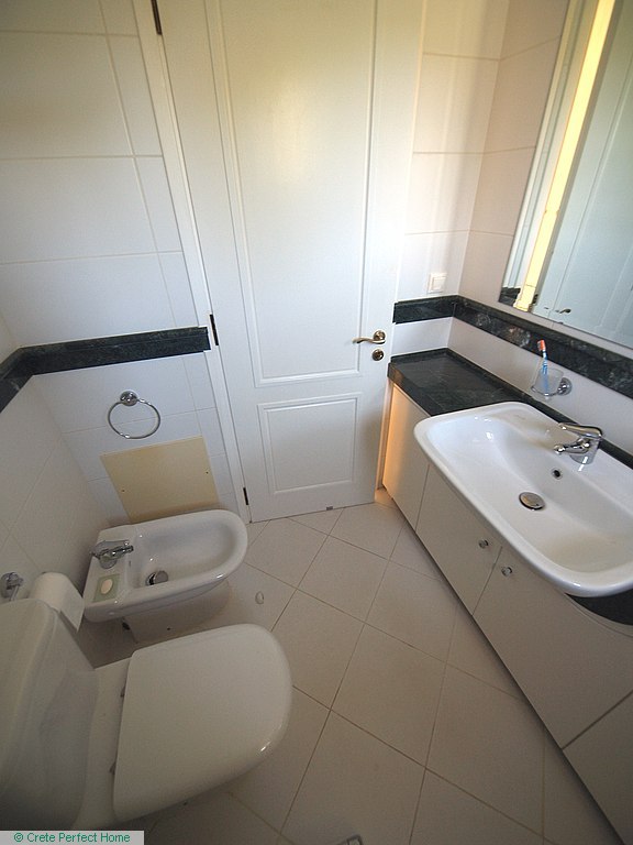 Luxurious white marble stairs lead up to the first floor, where the master bedroom is located. This bedroom has fitted wardrobes, a dressing room, and a roomy bathroom with shower, sink, WC, bidet, and further green marble features. There are also large glazed balcony doors which lead out onto a large balcony with superb views of the Gulf of Kissamos and the rugged mountainous peninsulas of Gramvousa and Rodopos.