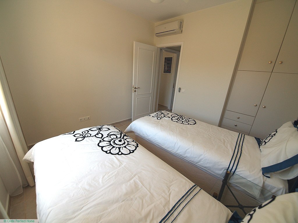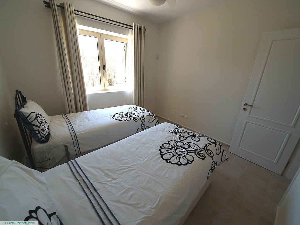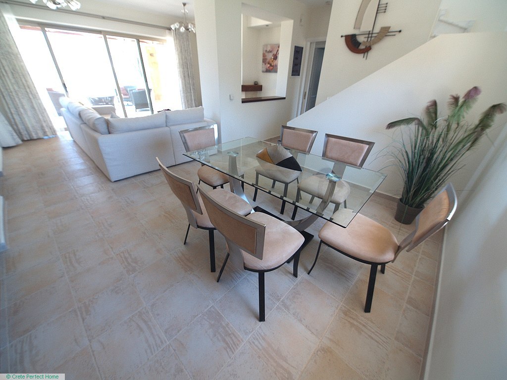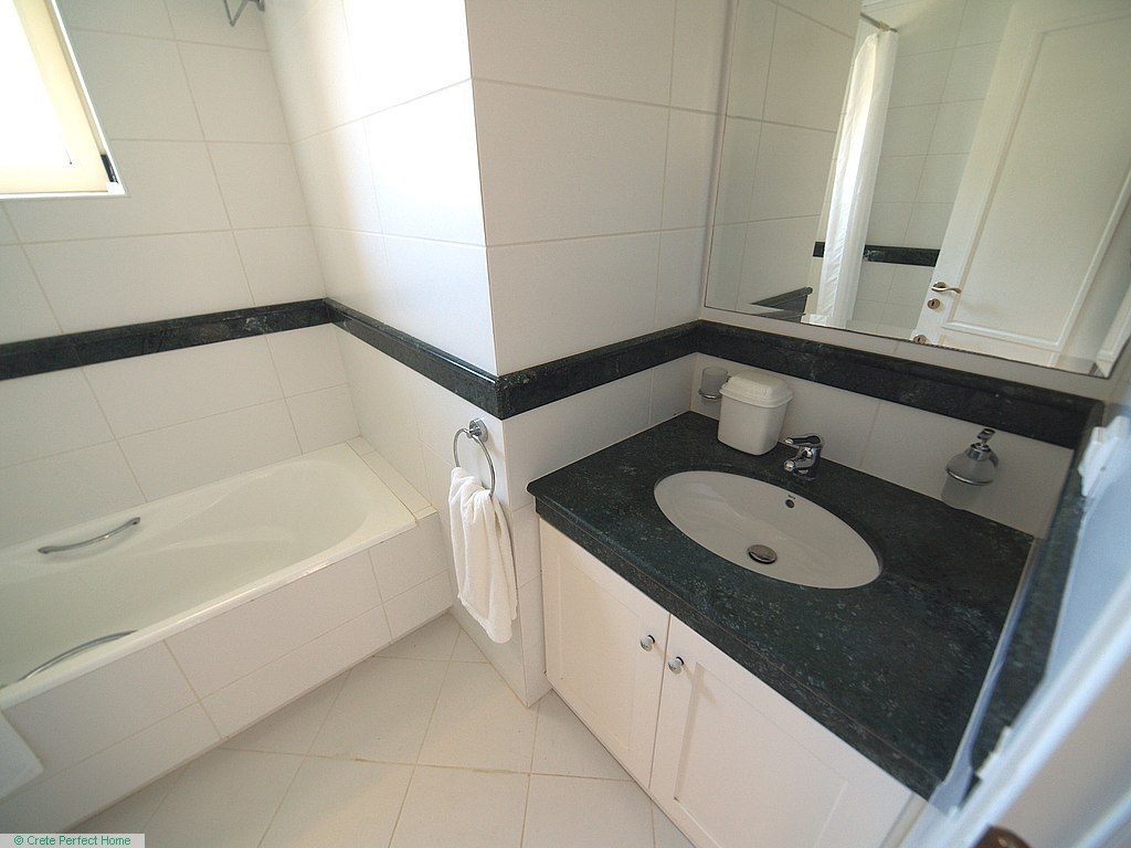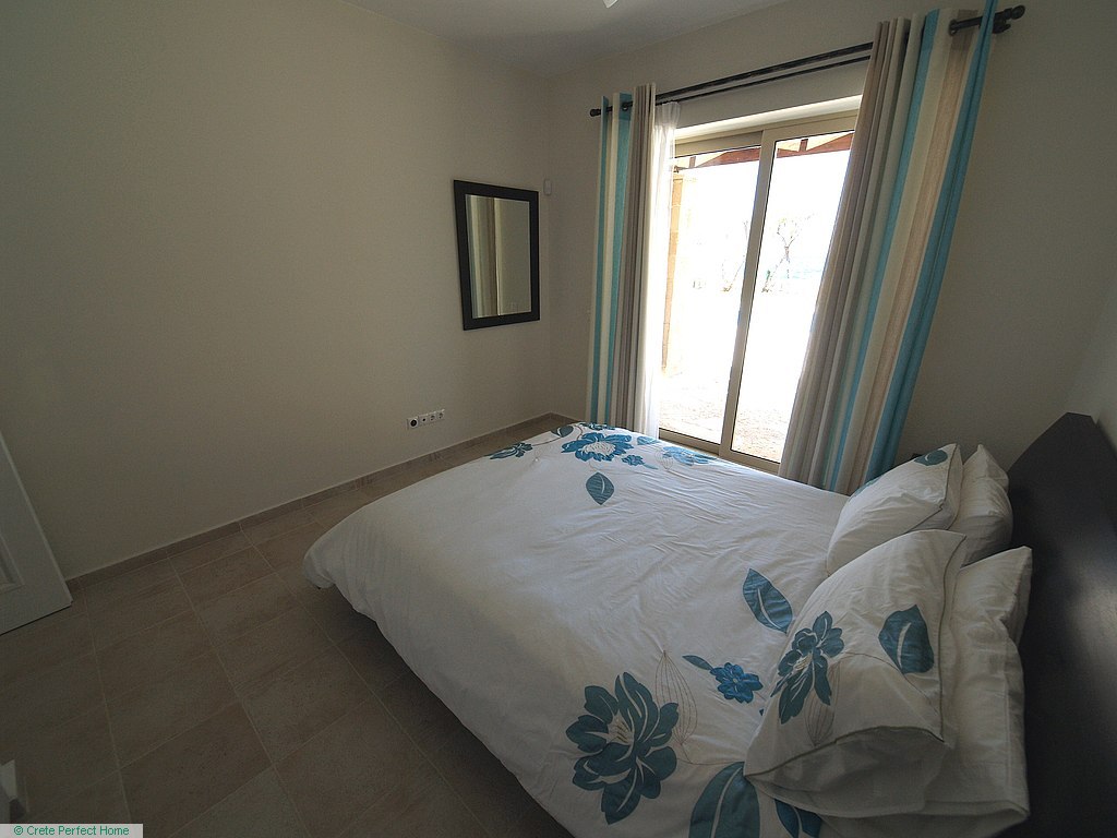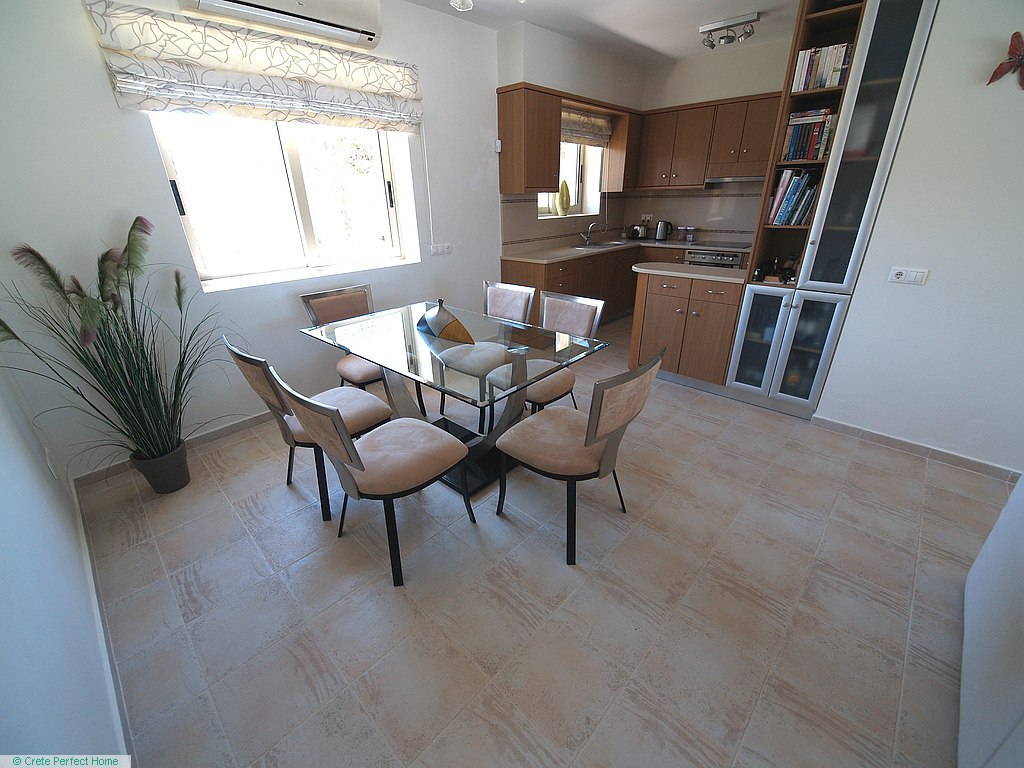 Luxurious white marble stairs lead up to the first floor, where the master bedroom is located. This bedroom has fitted wardrobes, a dressing room, and a roomy bathroom with shower, sink, WC, bidet, and further green marble features. There are also large glazed balcony doors which lead out onto a large balcony with superb views of the Gulf of Kissamos and the rugged mountainous peninsulas of Gramvousa and Rodopos.